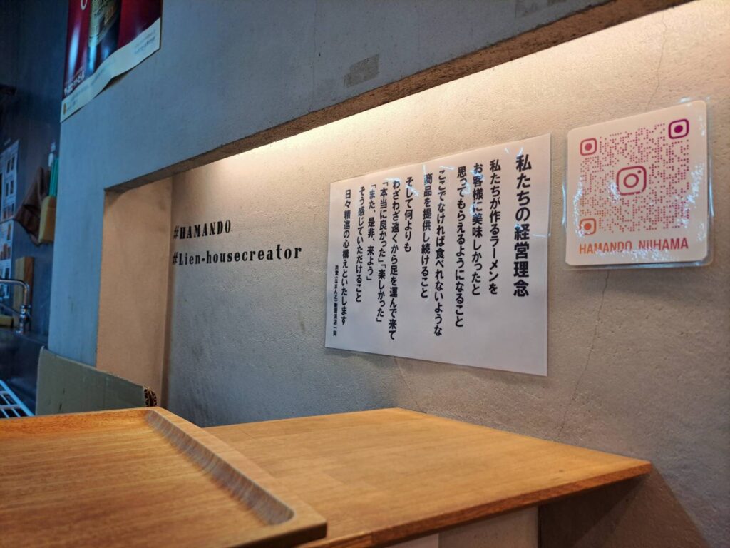 ラーメンが好きすぎて店を始めてしまったというエピソードだけで、期待値は最高潮に達します。厨房の壁には「私たちの経営理念」が掲げられており、「ここでなければ食べれないような商品を提供し続けること」という強い決意が記されています。この熱意が、一杯の丼に凝縮されているのです。
