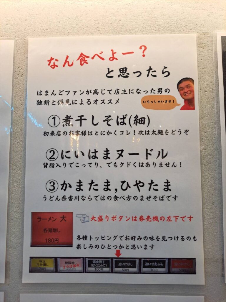 店主自らが「はまんどファンが高じて店主になった」と語るこのお店。その熱いこだわりと、実際に食べて分かった「新居浜ヌードル」や「煮干しそば」の魅力を、店内掲示板のディープな情報とともにお届けします!